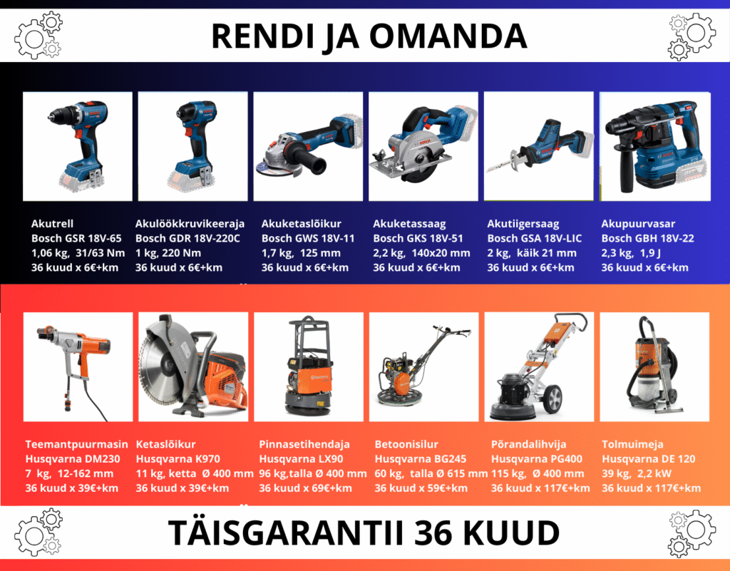 Kas vajad kvaliteetseid tööriistu ja seadmeid, kuid soovid vältida suuri esialgseid kulutusi? Varustaja24 “Rendi ja Omanda” pakub sulle võimaluse rentida tipptasemel tööriistu 3 aastaks soodsa kuumaksega – ja perioodi lõpus saavad need täielikult sinu omaks!