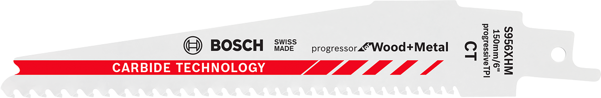 S 956 XHM Progressor for Wood and Metali tiigersaeleht tagab ülipika kasutusea paksude ja õhukeste materjalide lammutamisel. Sellel on lihvitud karbiidhambad, mis on loodud spetsiaalselt kõrgtugeva terase lõikamiseks puidus. Saelehe progressiivselt suurenev hammaste vahe tagab kiired lõiked väga erineva tihedusega materjalide töötlemisel ning selle lai teravnev põhiosa (25 mm) ja paks lõikematerjal (1,25 mm) tagavad lammutamiseks vajaliku stabiilsuse. Lisaks on hambad kinnitatud karbiidtehnoloogiat kasutades ülielastse süsinikterasest põhiosa külge, muutes tiigersaelehe sobivaks kõige raskemateks puidu ja metalli lammutustöödeks. See on standardpikkusega 150 mm, tagades lõikeulatuse kuni 100 mm. Kasutamiseks 1/2-tollise universaalvarrega tiigersaagidega.